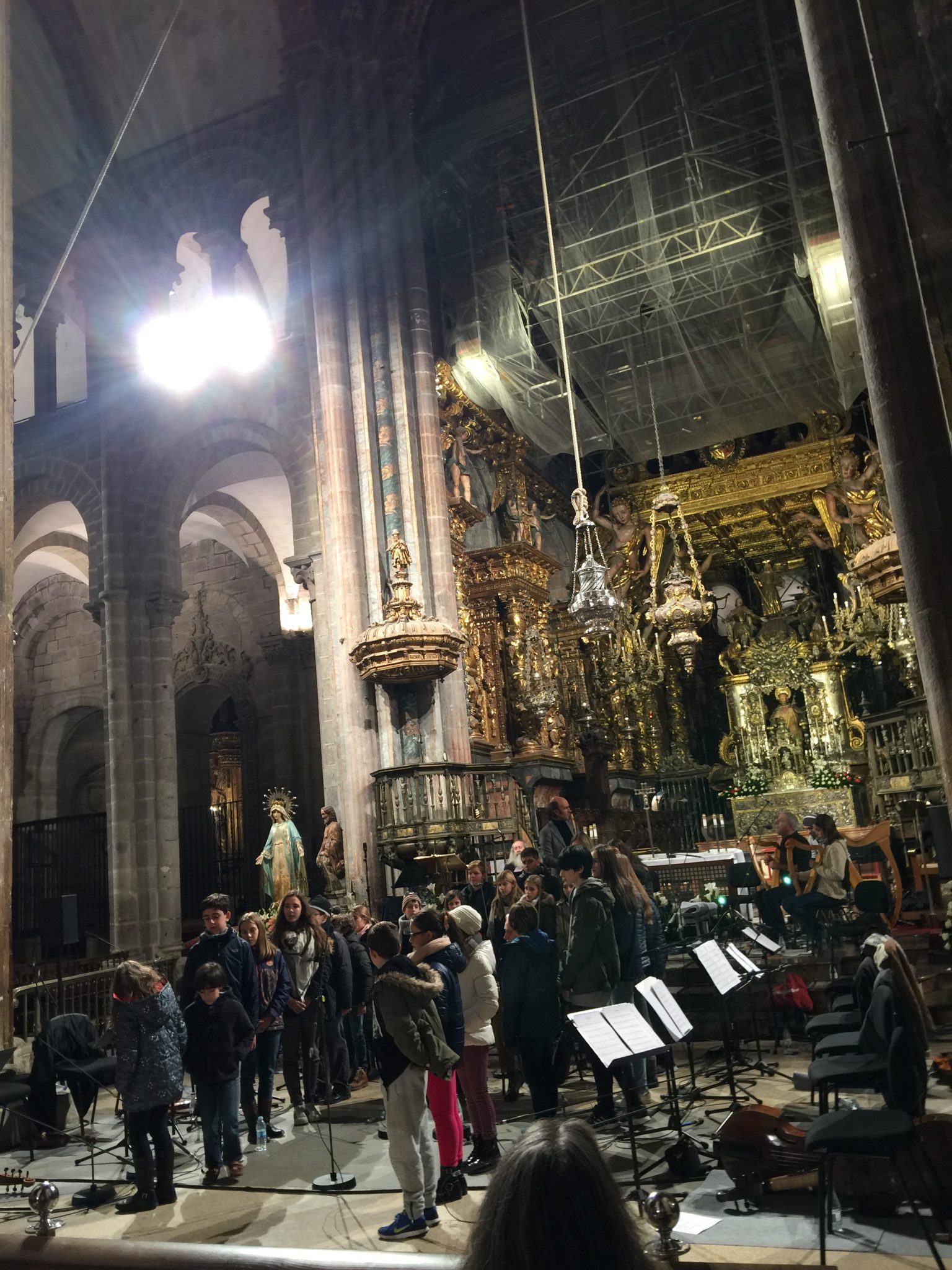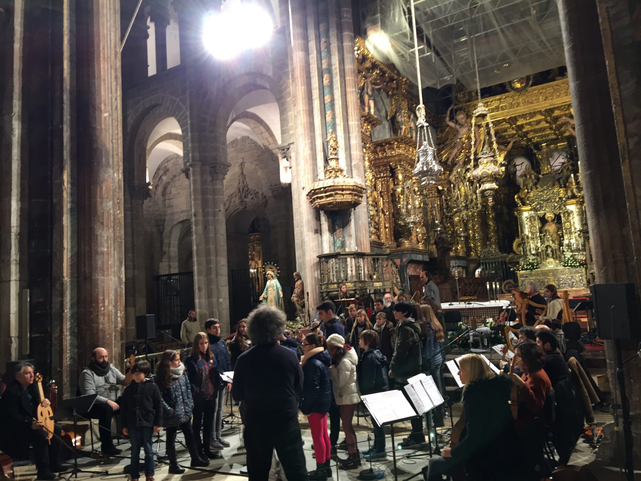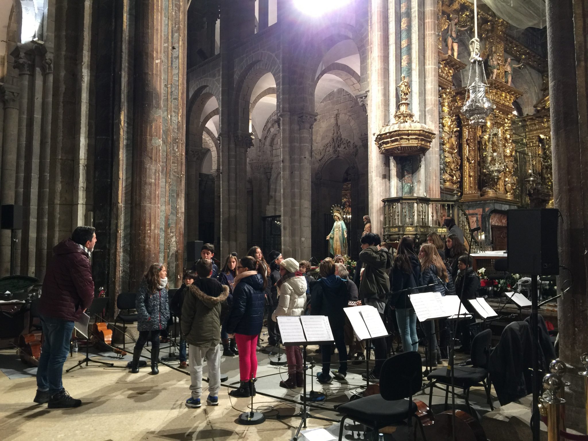 Y llegó la semana del concierto, así que el lunes 21 y martes 22, una vez que la Catedral de Santiago se cerraba al culto y las visitas, el equipo de producción de PXC Producción e xestión cultural, lo preparaba todo para poder ensayar el concierto del día 23. A pesar de la horas intempestivas, nuestros pequeños se comportaron como verdaderos profesionales y no dejaban de maravillarse de poder vocalizar en la capilla del Pilar y de poder ensayar con grandes músicos en un entorno privilegiado.