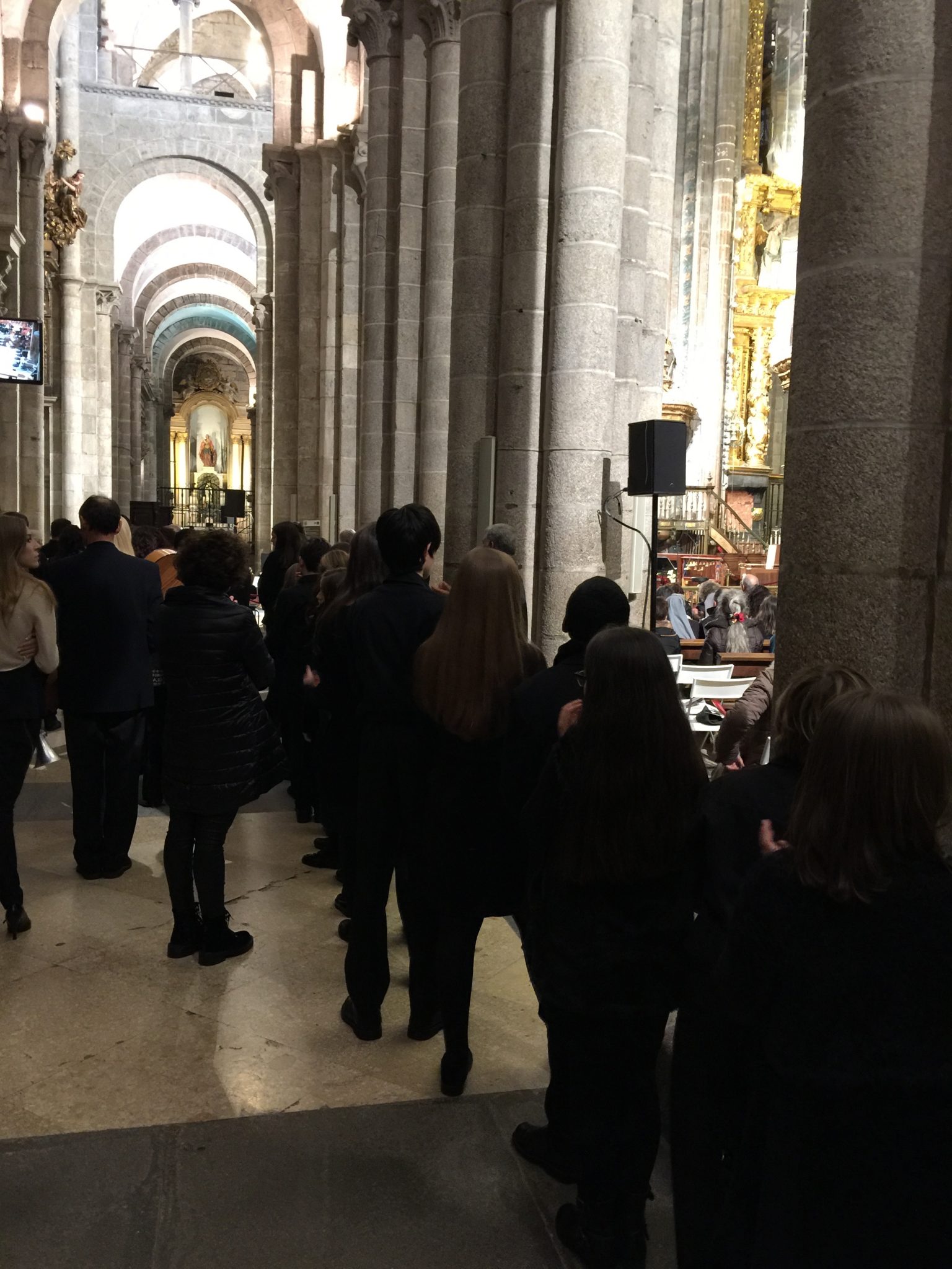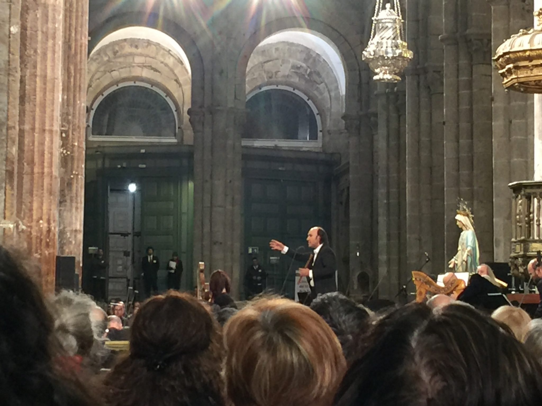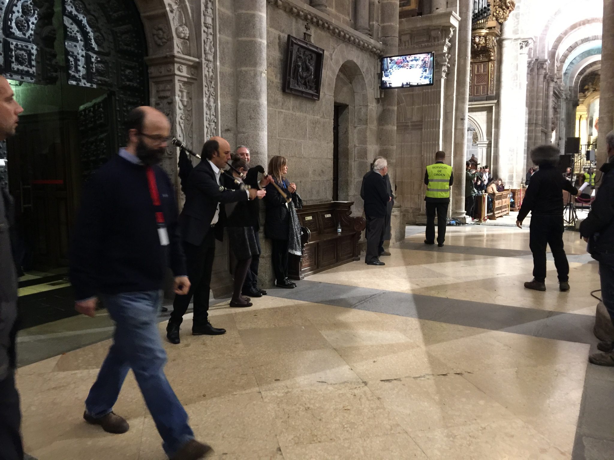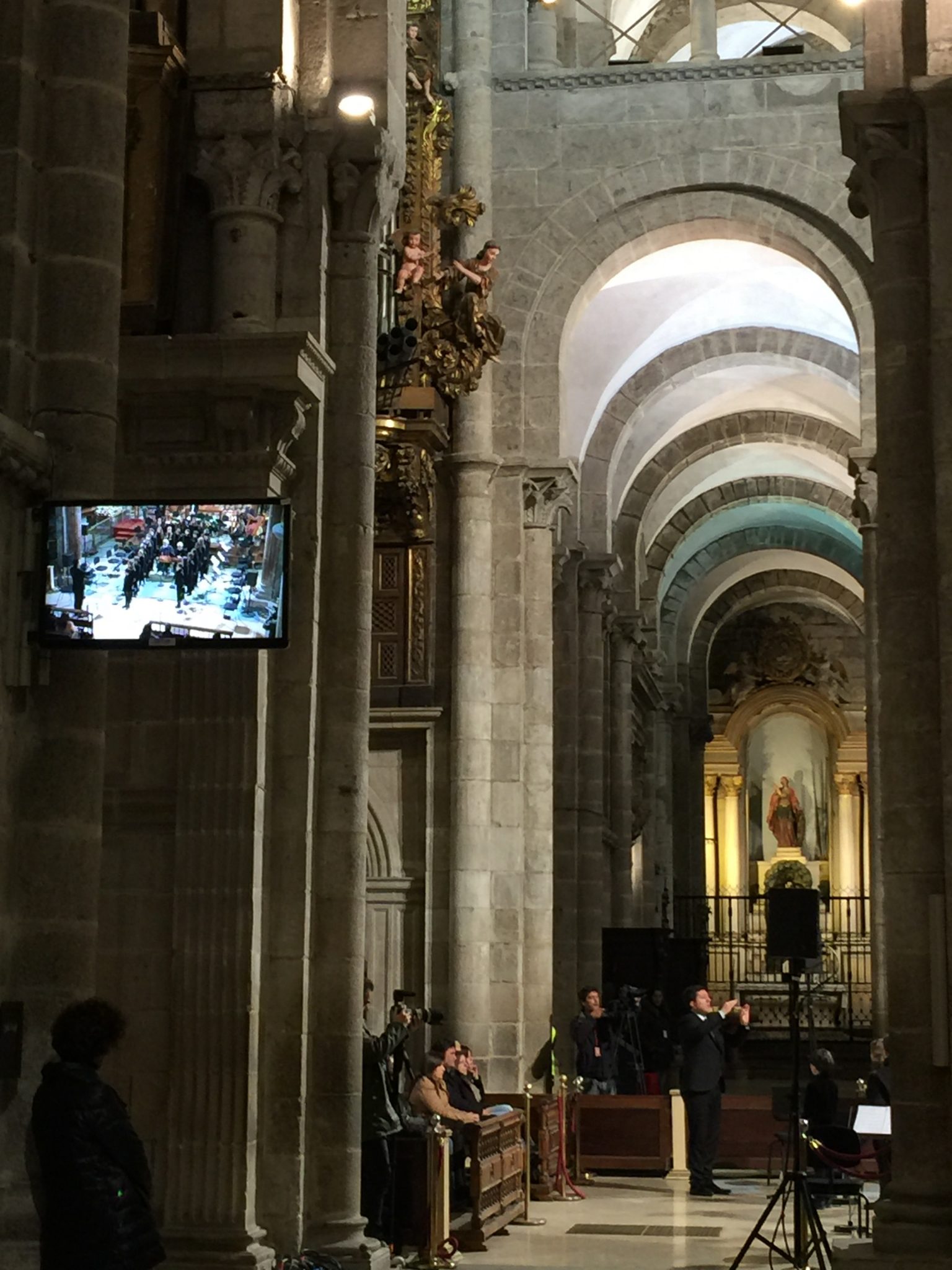 Primero, el equipo de producción nos llevó a la Hospedería de San Martín Pinario donde pudimos vocalizar y ensayar nuestras piezas en las antiguas caballerizas hasta que llegó el momento de trasladarnos ya a la Catedral para el concierto. Bueno en realidad para los dos conciertos, porque el de las 21.15 sería para autoridades y los participantes en la VI Conferencia General de la Asociación Española de Fundaciones que se celebraba esos días en la Fundación Barrié en A Coruña y la de las 22.15 para el público general que hubiera recogido las invitaciones en cualquiera de las sedes de la Barrié, y que se agotaron en poco minutos de abrir las puertas para su recogida.