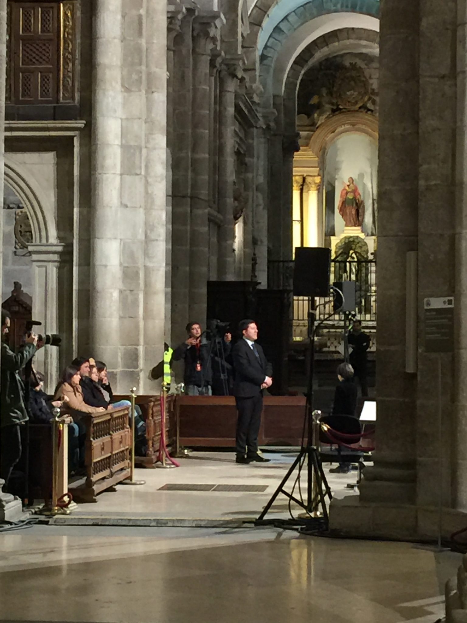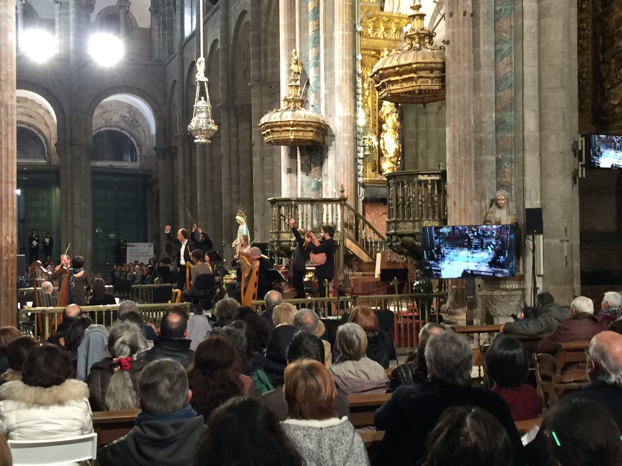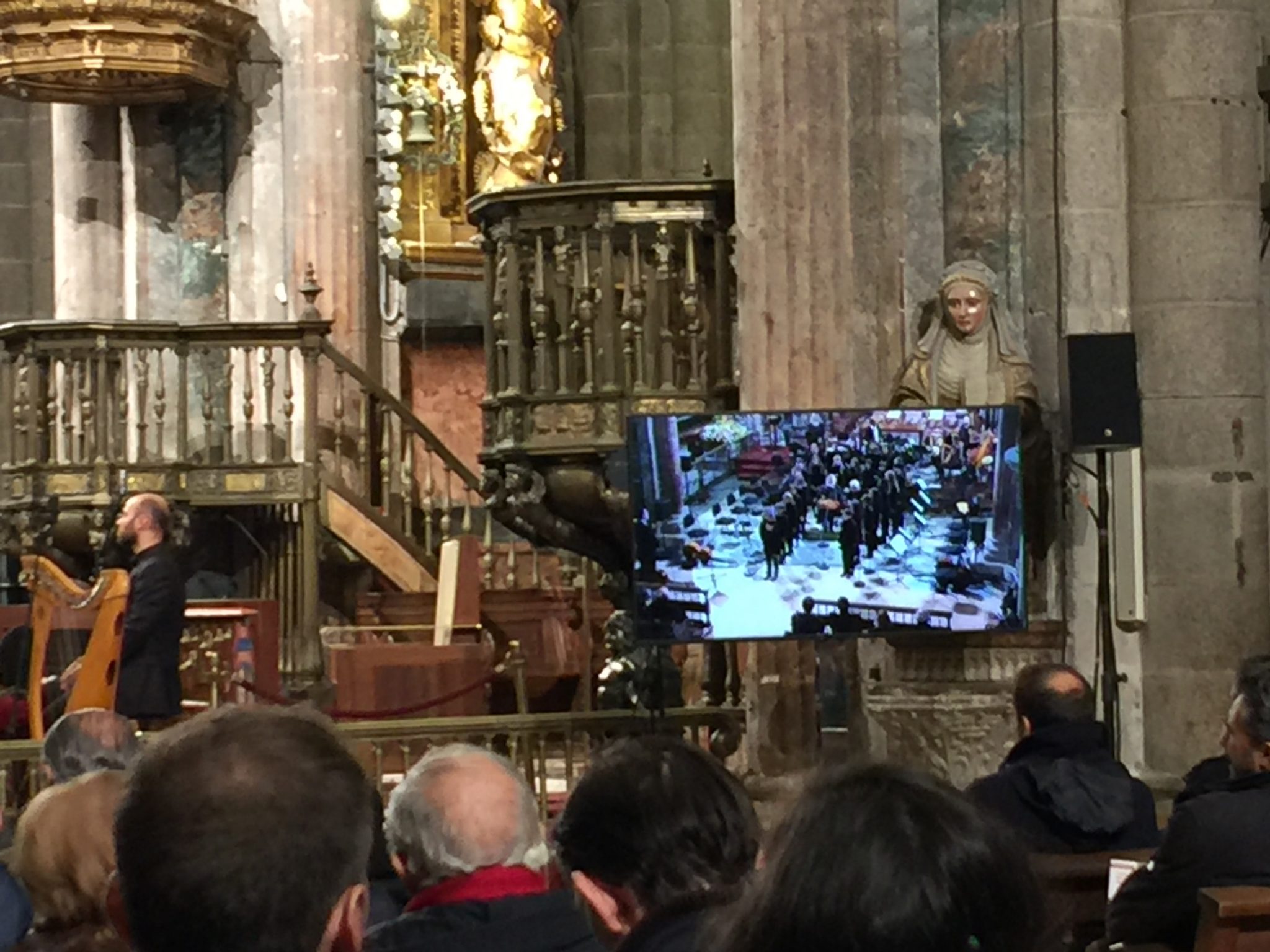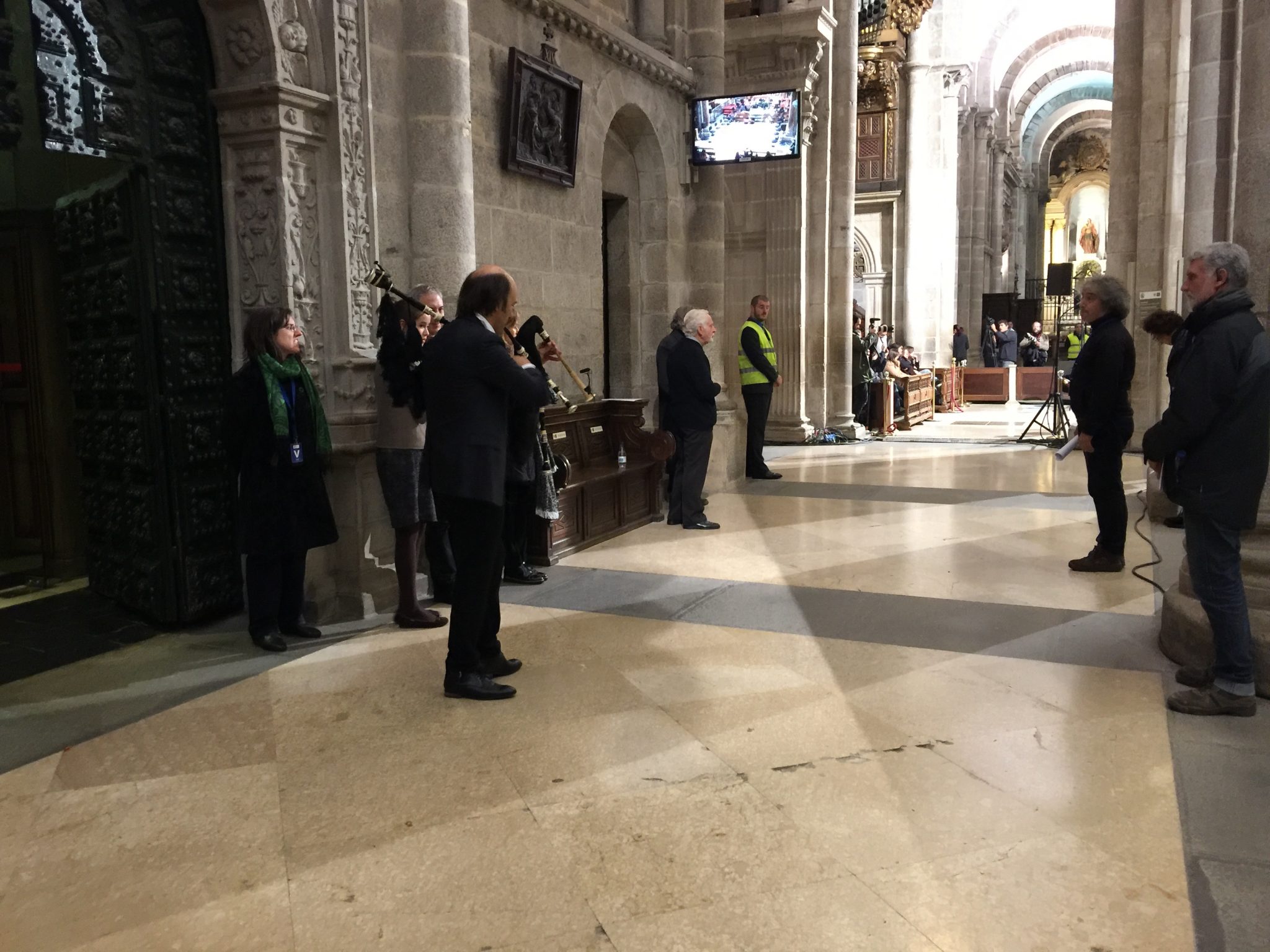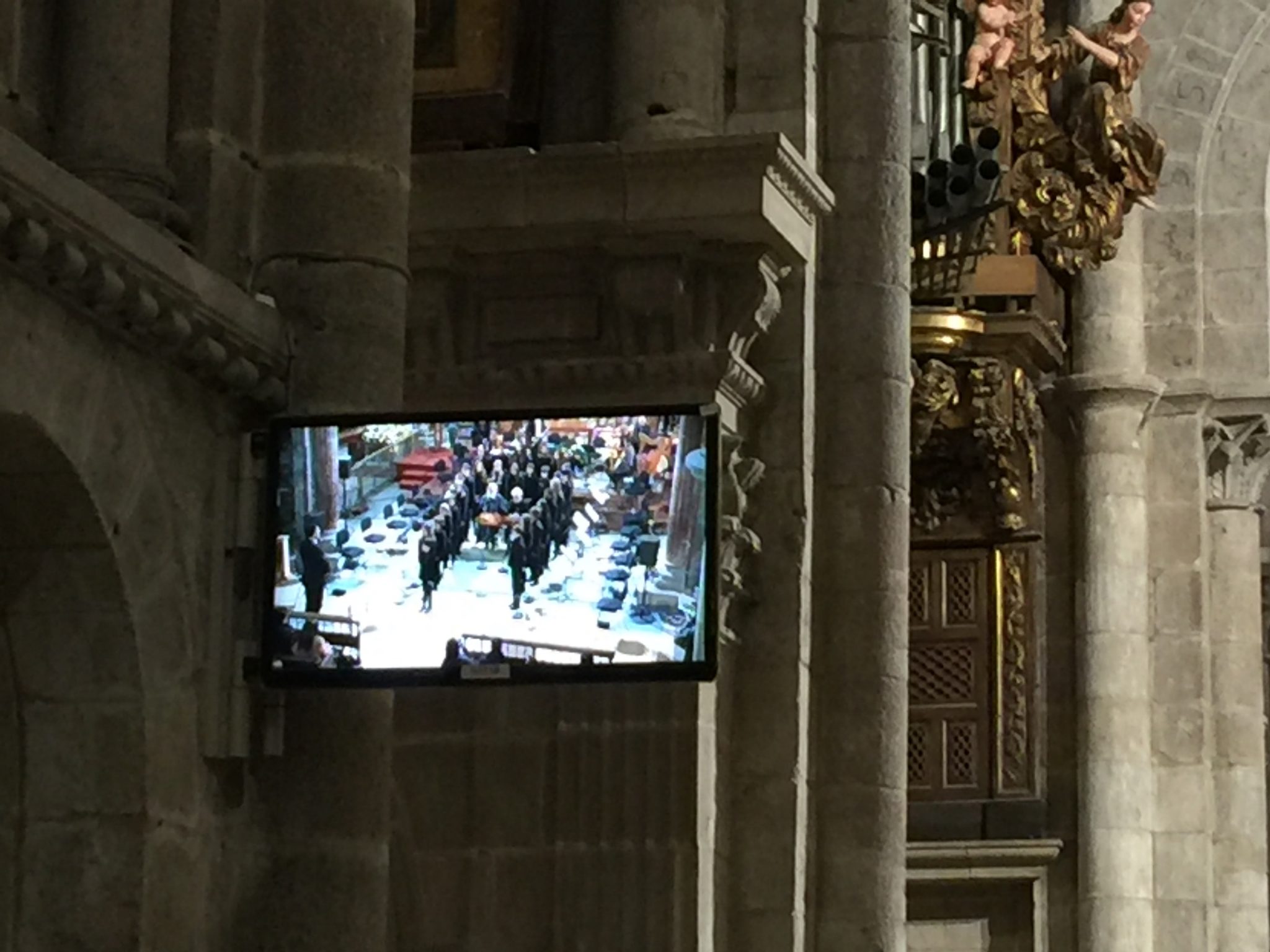 Primero, el equipo de producción nos llevó a la Hospedería de San Martín Pinario donde pudimos vocalizar y ensayar nuestras piezas en las antiguas caballerizas hasta que llegó el momento de trasladarnos ya a la Catedral para el concierto. Bueno en realidad para los dos conciertos, porque el de las 21.15 sería para autoridades y los participantes en la VI Conferencia General de la Asociación Española de Fundaciones que se celebraba esos días en la Fundación Barrié en A Coruña y la de las 22.15 para el público general que hubiera recogido las invitaciones en cualquiera de las sedes de la Barrié, y que se agotaron en poco minutos de abrir las puertas para su recogida.