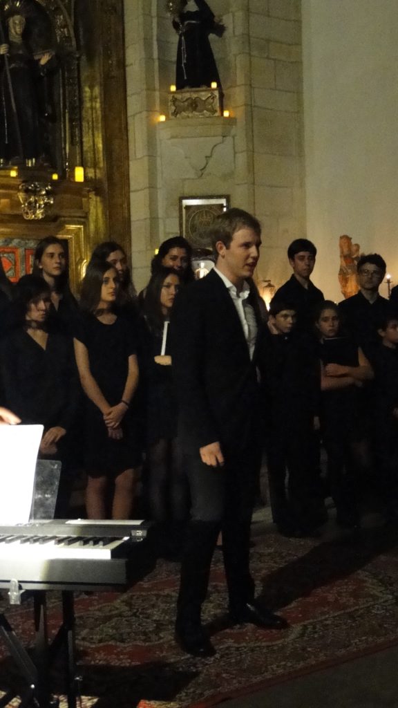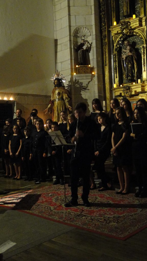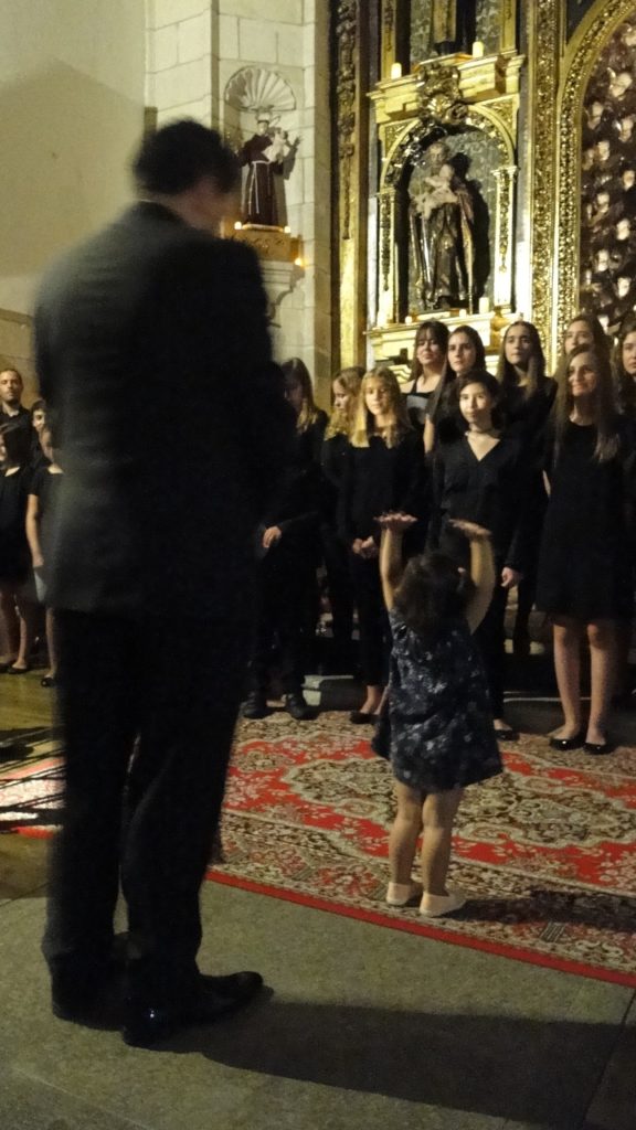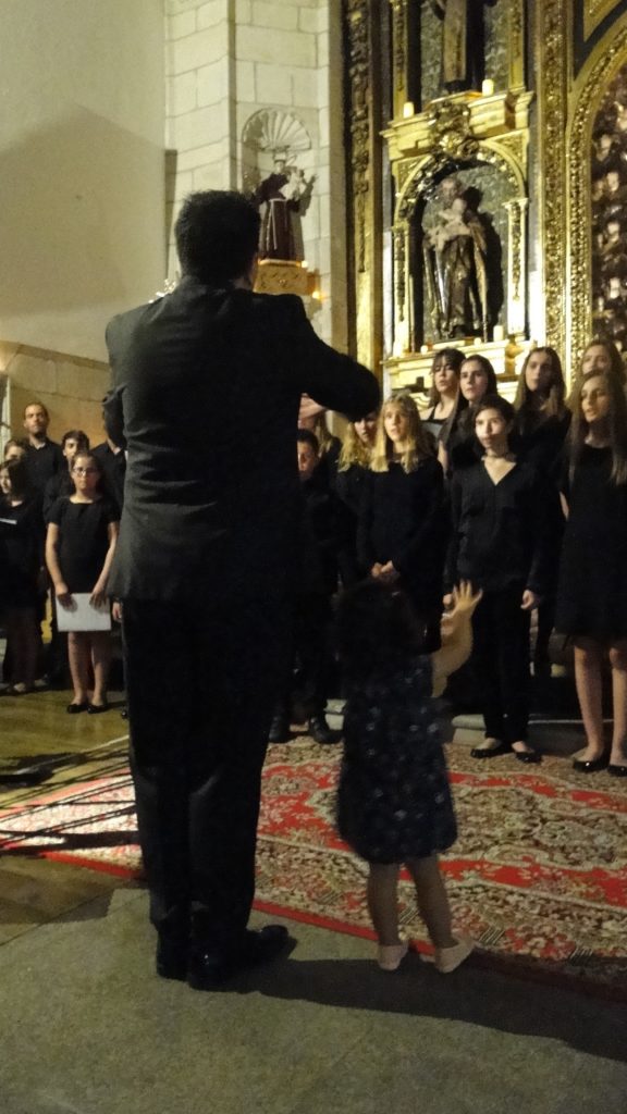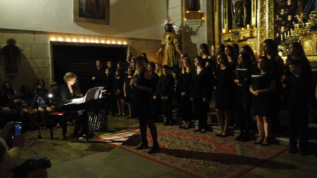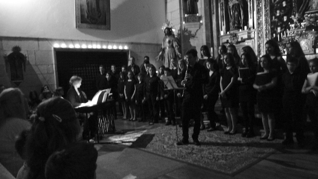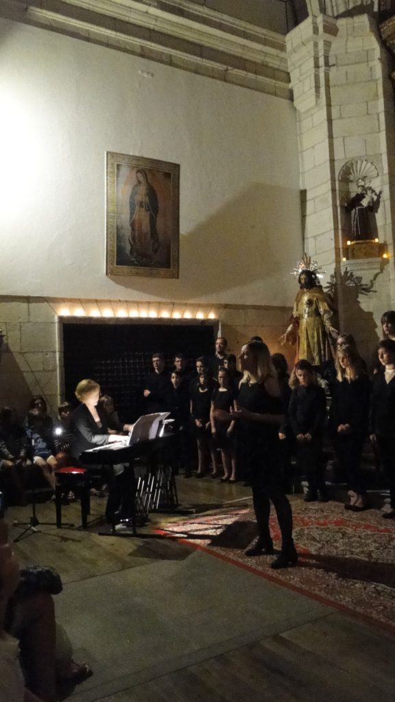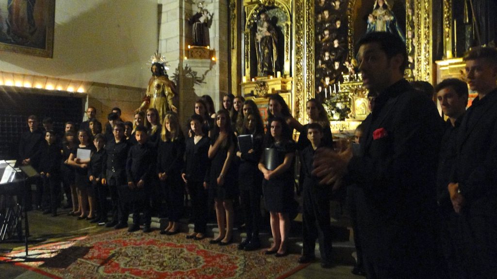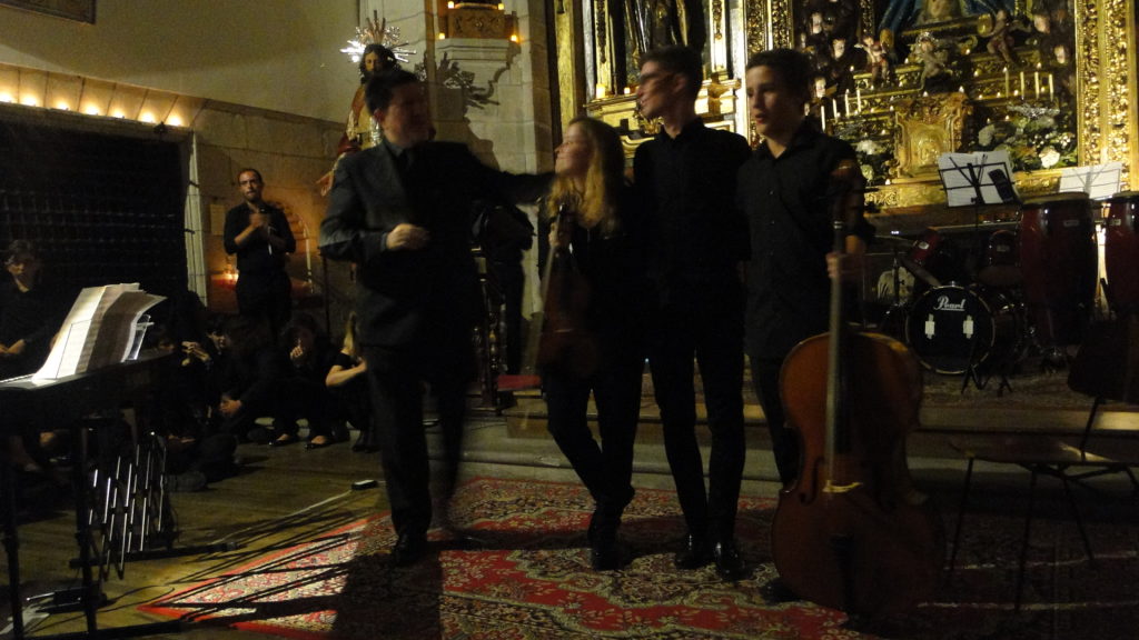 A seguir, unha desas cousas que só se lle poden ocorrer a Pablo Carballido: subir a Romeu, Jaime e Alex a cantar o trío dos xenios da ópera Die Zauberflöte (a frauta máxica) ao retablo da igrexa. Desde logo, era un bo sitio para proxectar a voz!