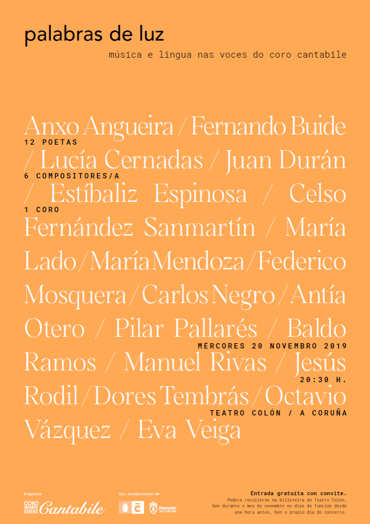 O vindeiro 20 de novembro, ás 20:30 horas, presentamos o noso proxecto Palabras de Luz no teatro Colón, con entrada gratuíta con invitación