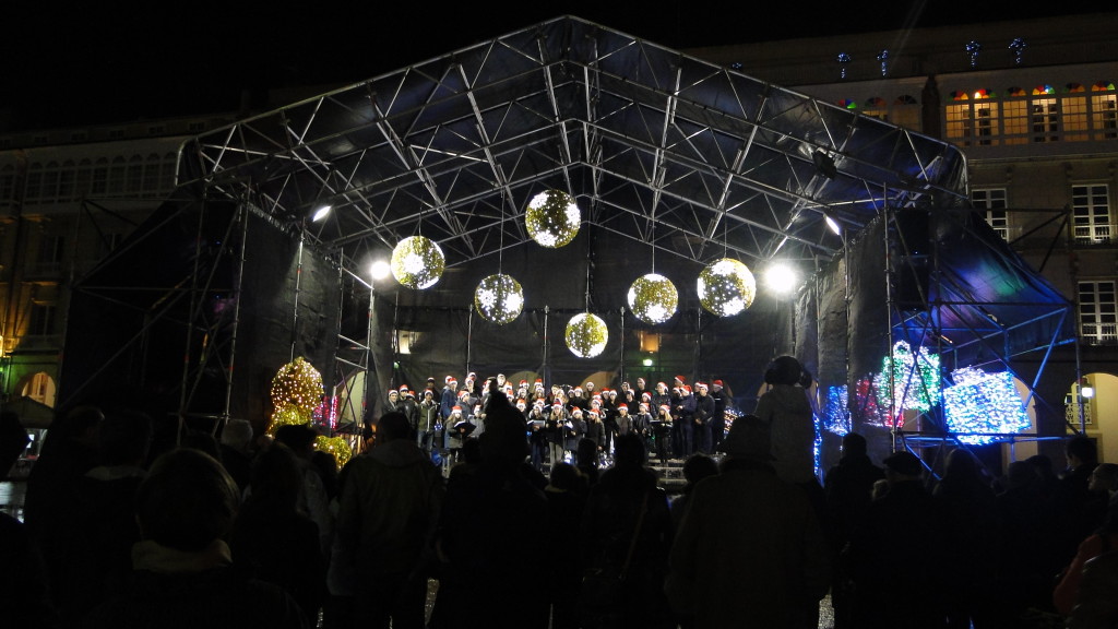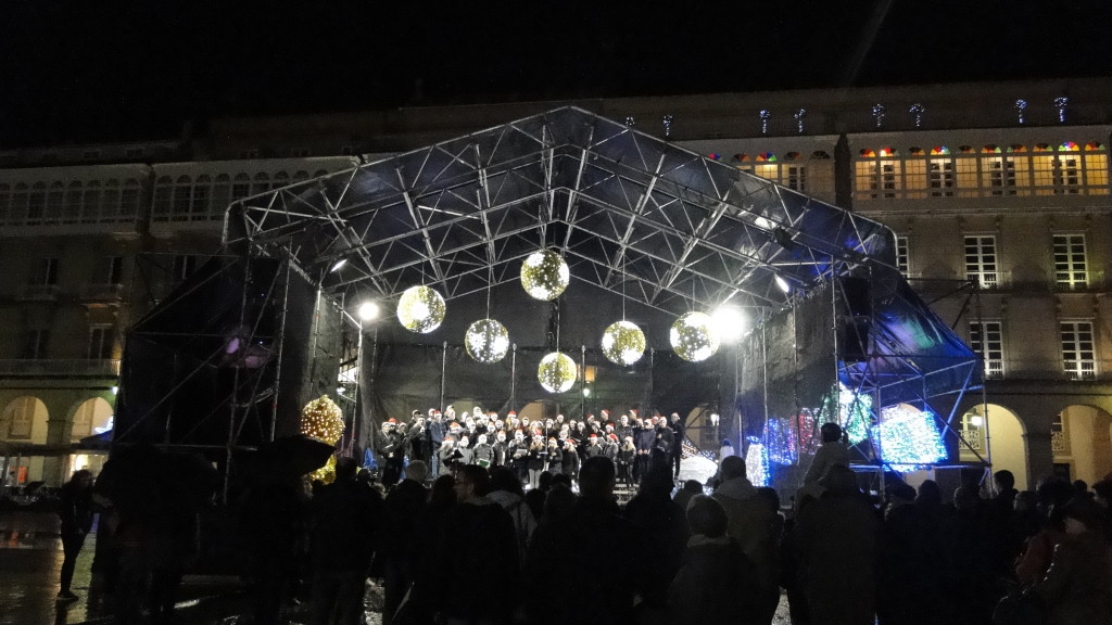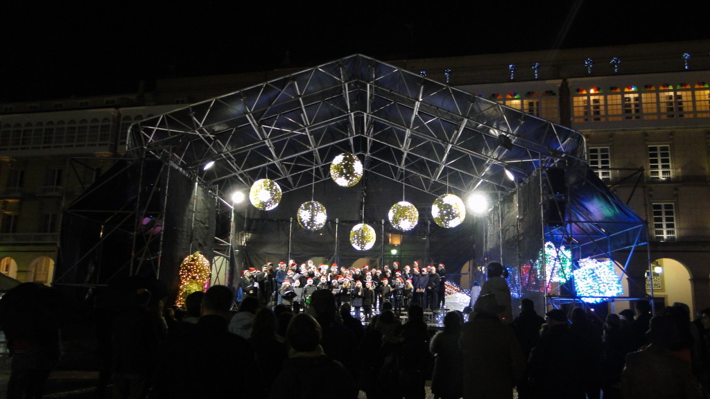 Llovía y mucho cuando llegamos a María Pita. Tanto que el escenario estaba inundado casi hasta la mitad así que no pudimos conectar nuestro piano. Si queríamos cantar, tenía que ser un concierto completamente “a capella” y con la incertidumbre de si podríamos hacerlo hasta el final.