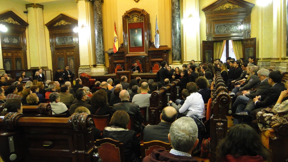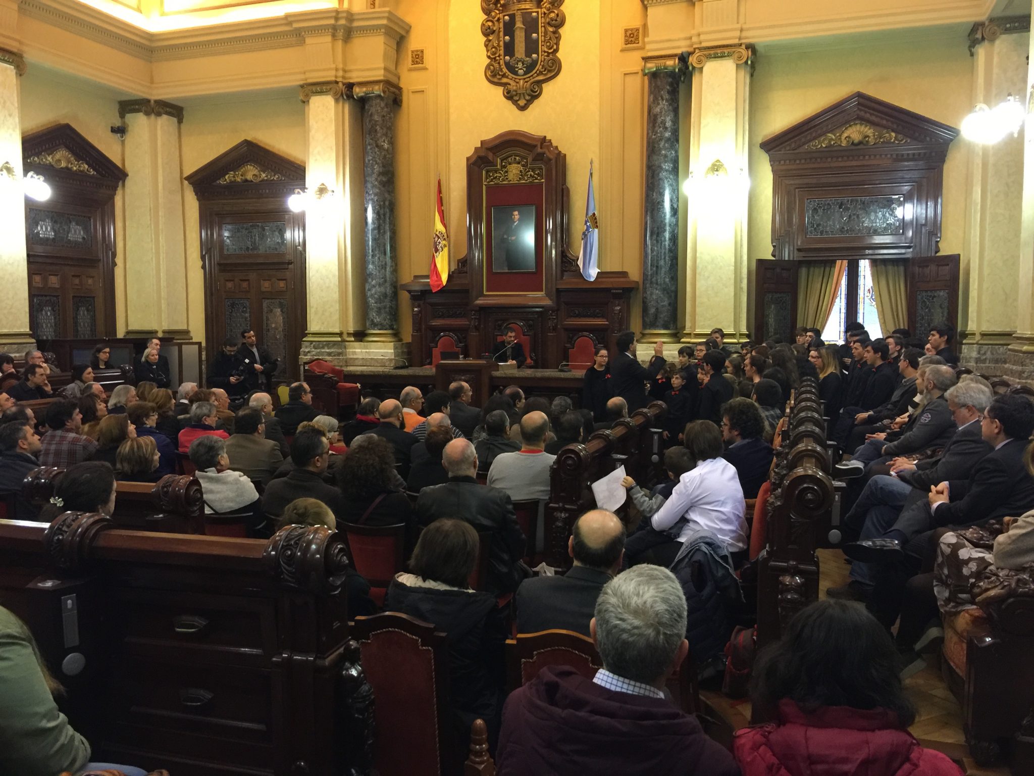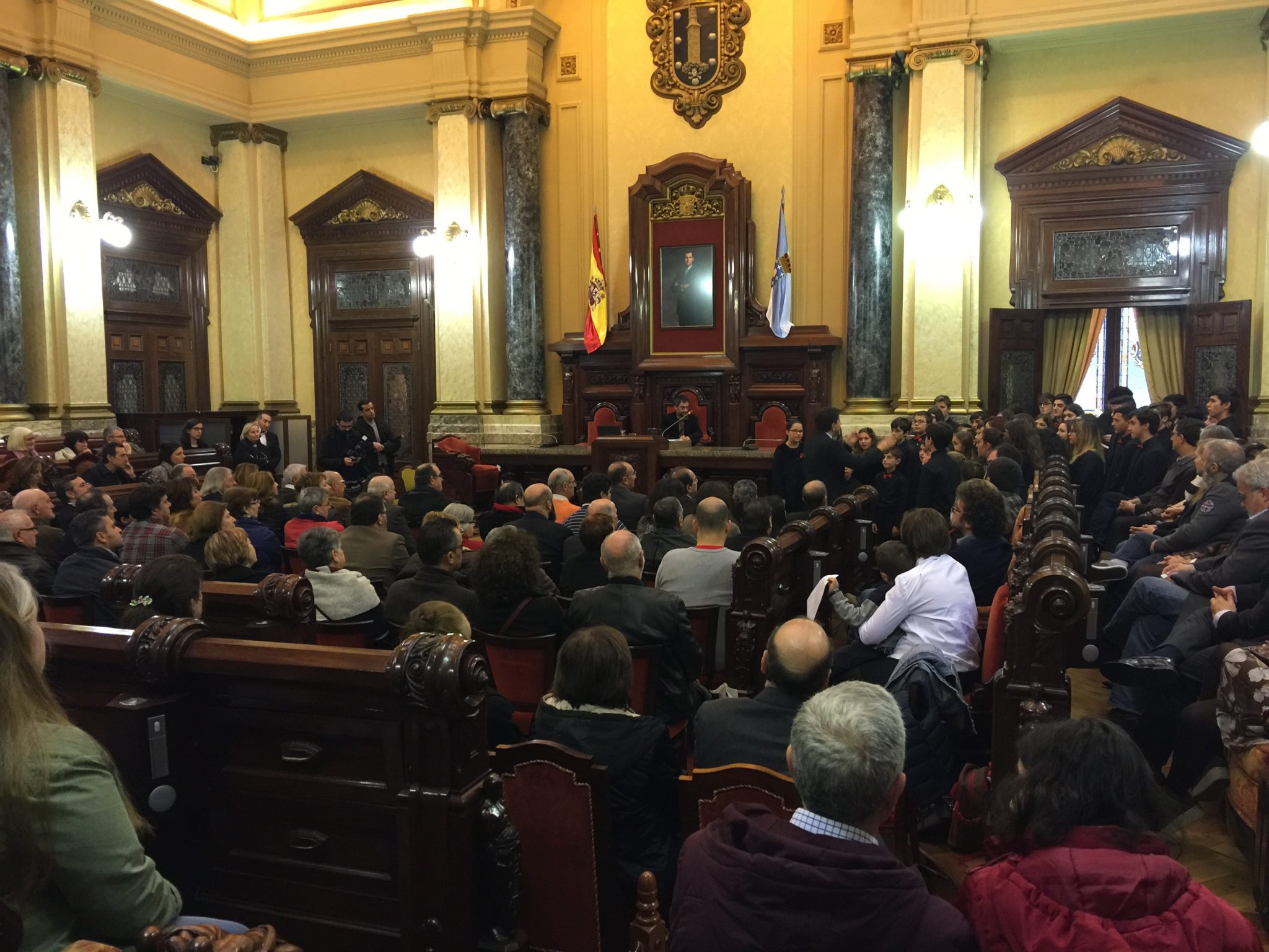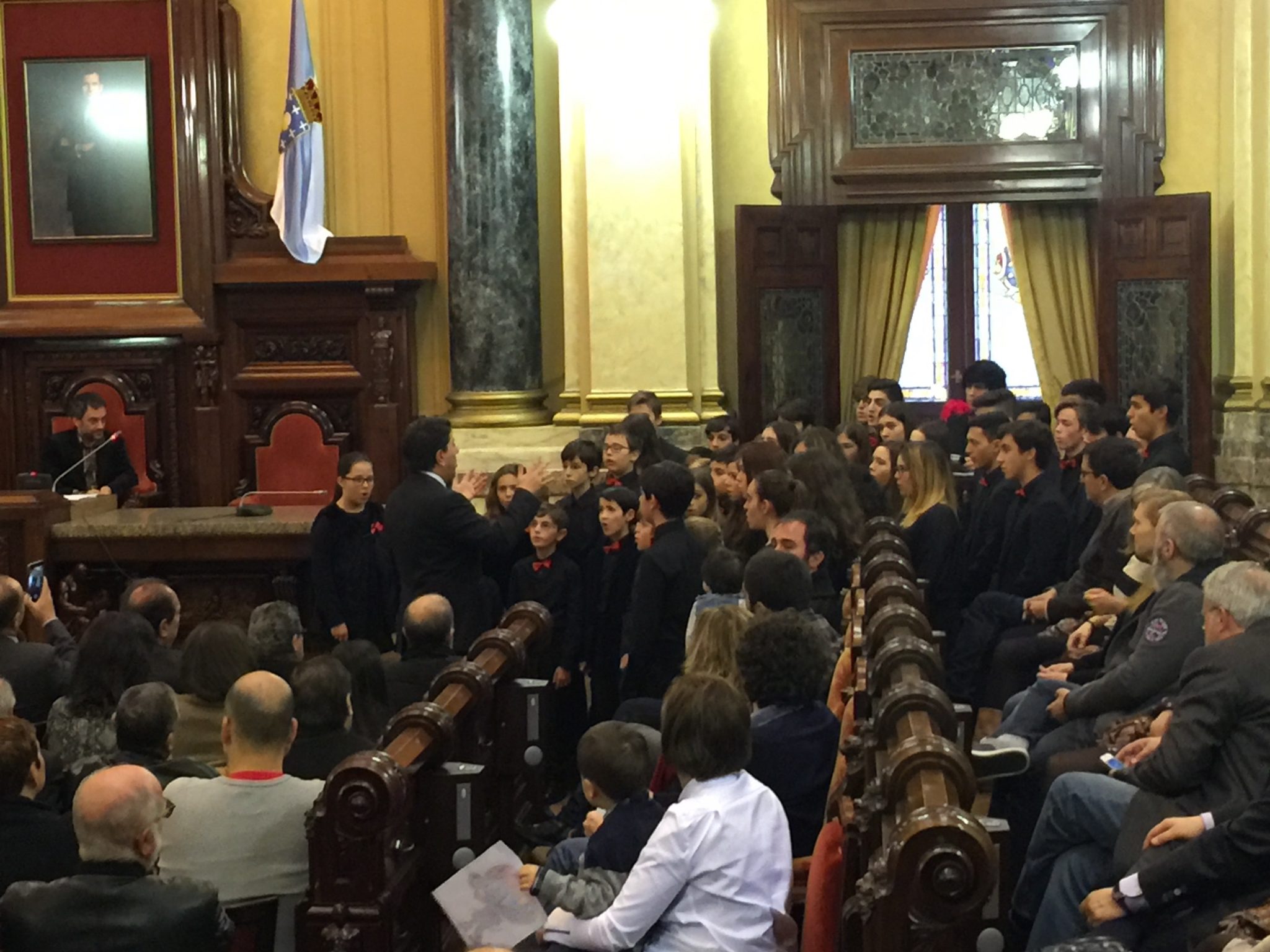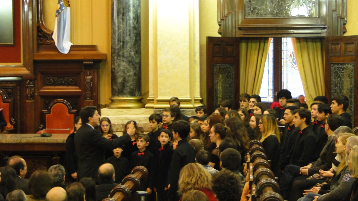 Comezabamos a xornada poñendo música á recepción aberta no palacio municipal de María Pita que realizou o Concello da Coruña con motivo das festas de Nadal. Despois do discurso do alcalde, Xulio Ferreiro, interpretamos algunhas panxoliñas que xa formaran parte do programa do concerto de Nadal do pasado día 28 en San Nicolás, unha cita xa tradicional dentro da nosa axenda que compartimos cun templo repleto de público.