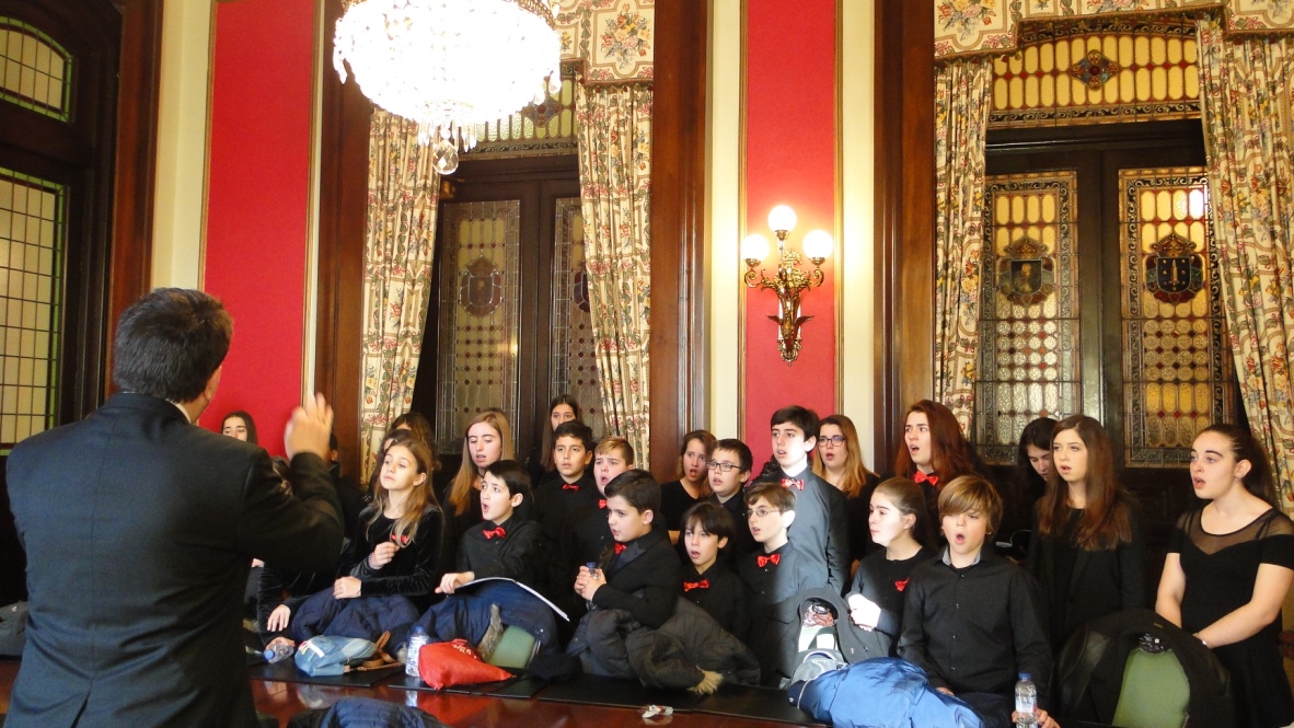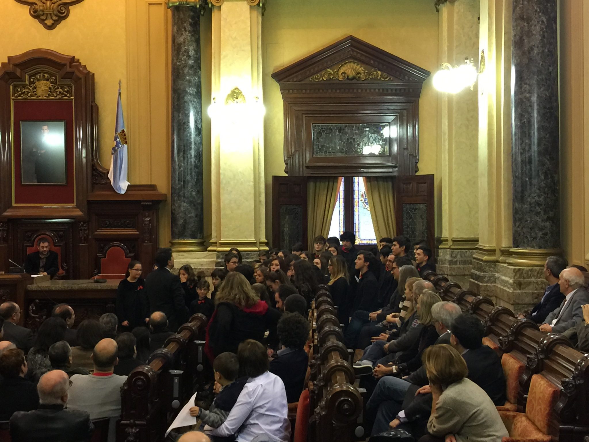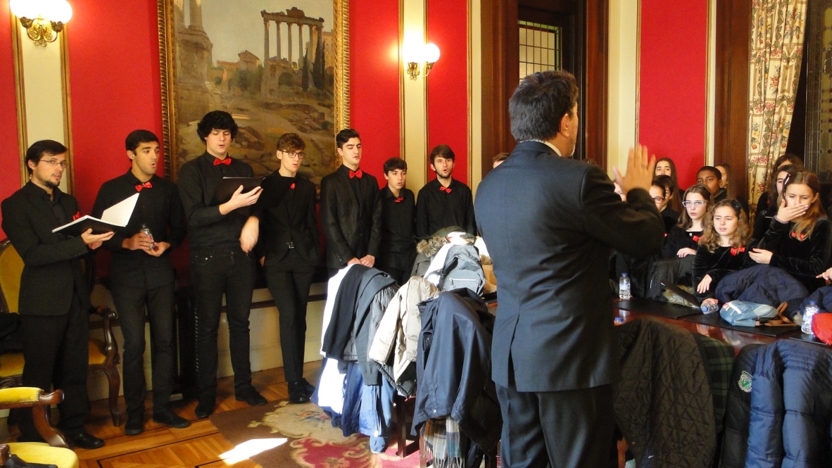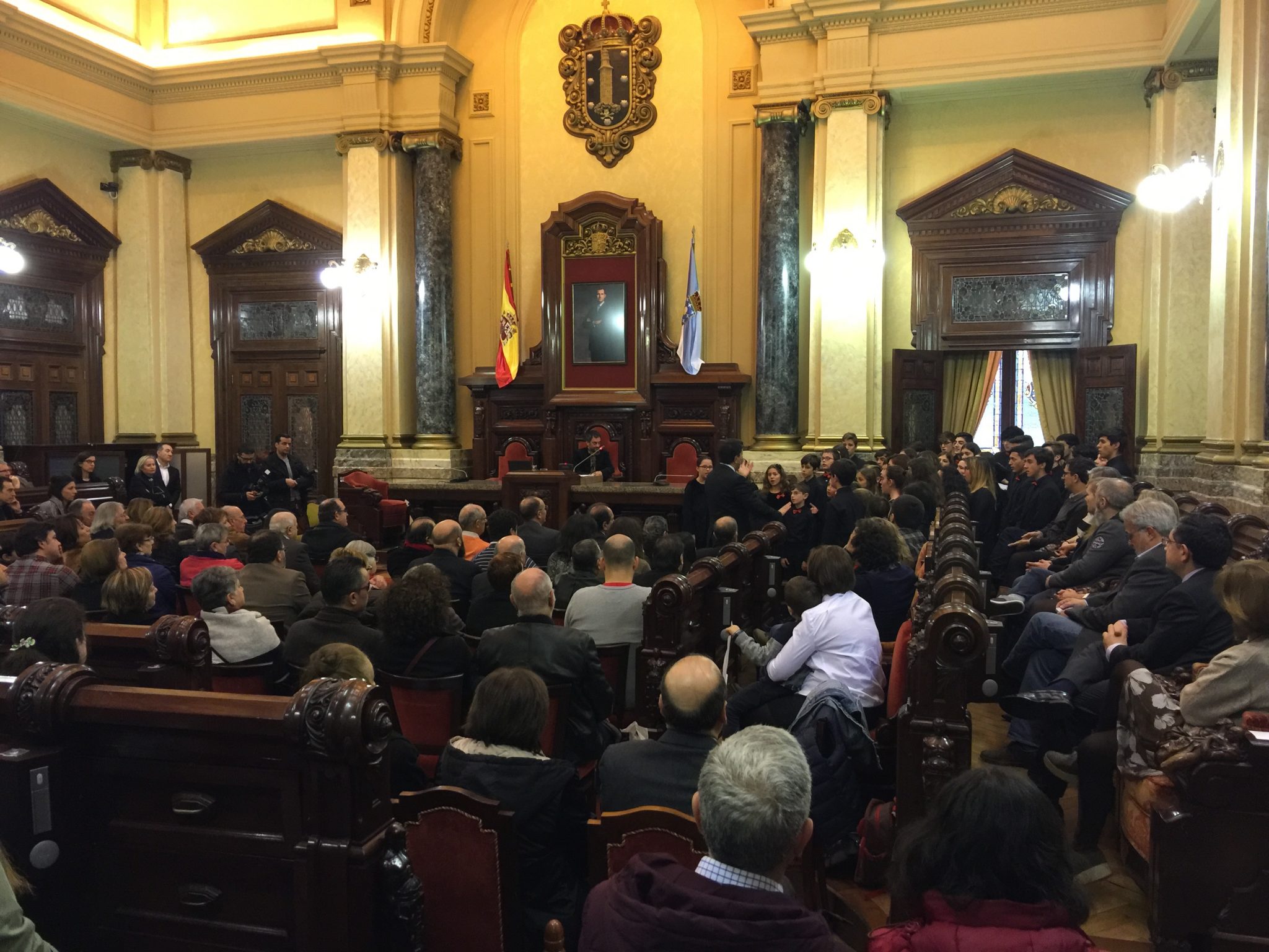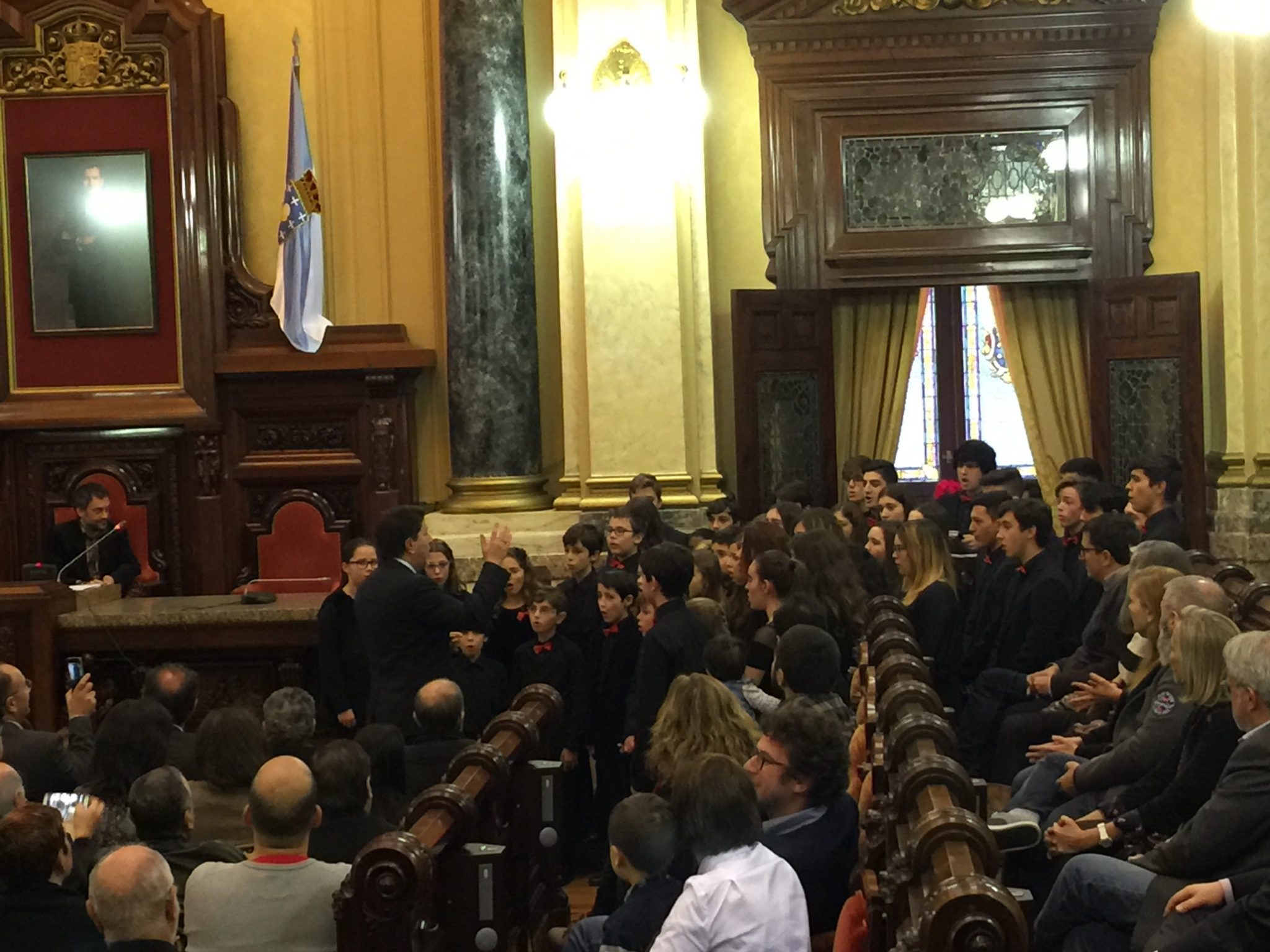 Comezabamos a xornada poñendo música á recepción aberta no palacio municipal de María Pita que realizou o Concello da Coruña con motivo das festas de Nadal. Despois do discurso do alcalde, Xulio Ferreiro, interpretamos algunhas panxoliñas que xa formaran parte do programa do concerto de Nadal do pasado día 28 en San Nicolás, unha cita xa tradicional dentro da nosa axenda que compartimos cun templo repleto de público.